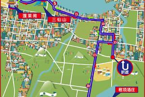 Hepingsong Square -- Zhongloubei Road -- Beiguan Road -- South gate of Penglai Pavilion -- Haibin Road -- Shanghai Road -- Beijing Road -- Shandong Road -- Jinchuang Road -- s211 Provincial Highway -- Junding Hotel -- Jinchuang Road --Shandong Road -- Beijing Road --Shanghai Road -- Haibin Road -- Hepingsong Square
